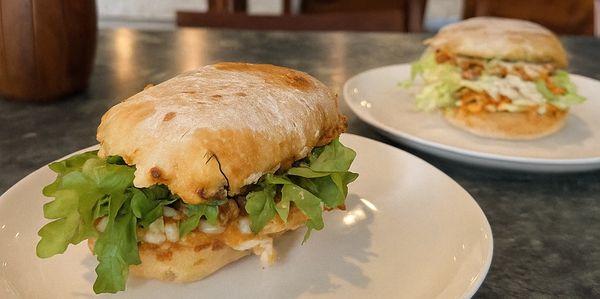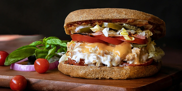 Wholesome millet-wheat ciabatta filled with your choice of protein or veggies, topped with ricotta, mozzarella, onion, black olives, jalapeno, salsa, chipotle, mayo, iceberg, tomato & gherkins.